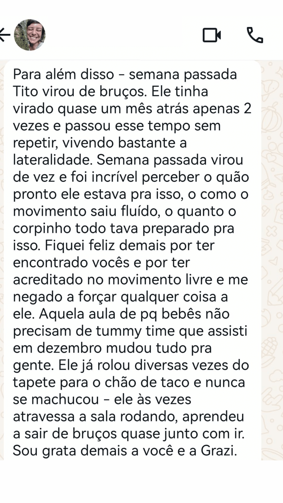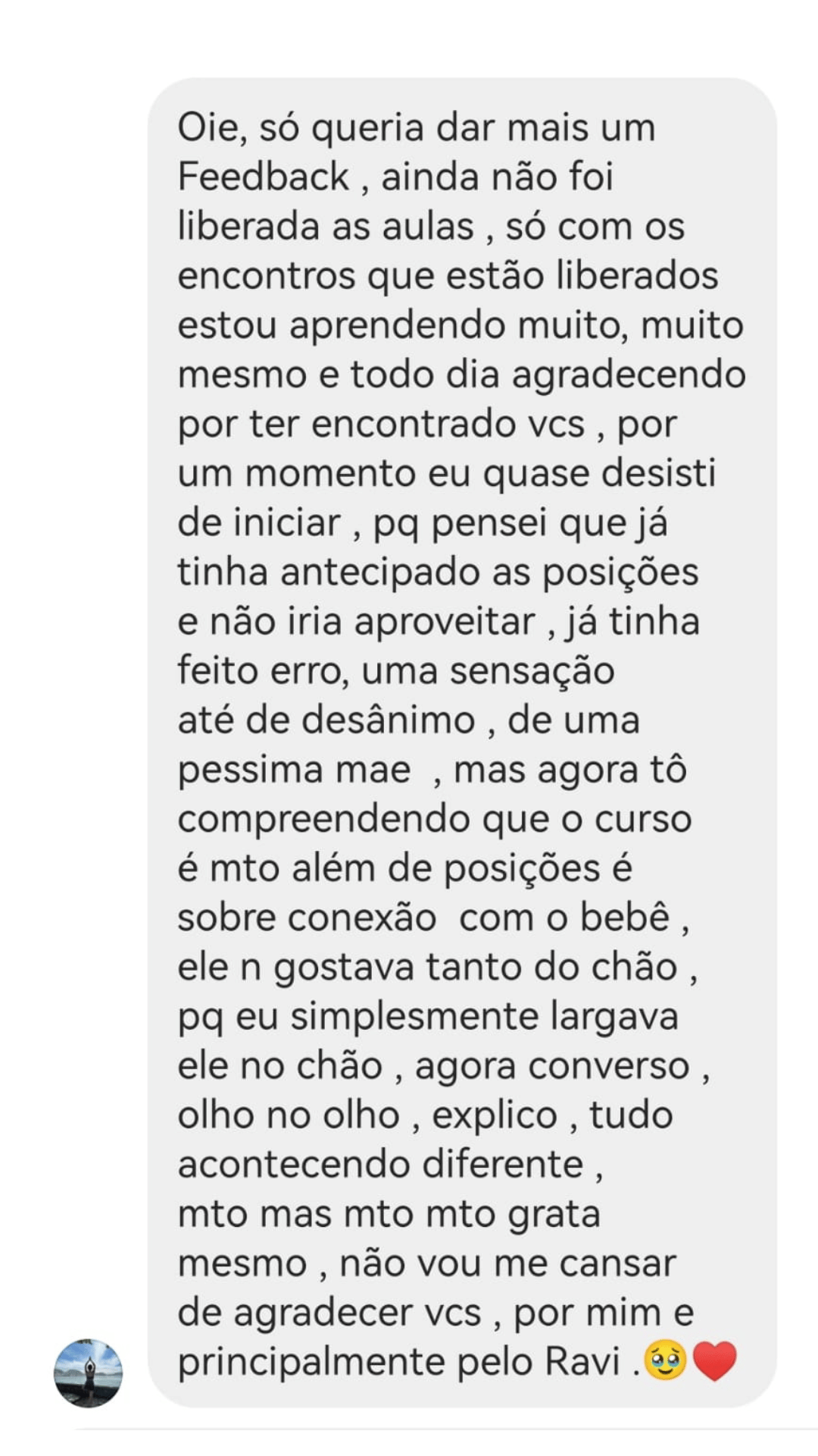 3. Sempre que uma aluna entra no curso é orientada a ver as três primeiras aulas, para ter uma boa base sobre a abordagem Pikler e começar a praticá-la. Após essas primeiras aulas, você poderá ver as aulas específicas conforme sente a necessidade. Essas aulas vão te fazer companhia e te ajudar muito, o que representa ganho de tempo e qualidade de vida. Exemplos: você está perdida sobre quais brinquedos oferecer em cada fase do desenvolvimento motor? Temos uma aula inteira só mostrando materiais abertos de brincar e seus usos. Seu filho está perto de completar 6 meses e você está se preparando para a introdução alimentar? Veja a aula sobre introdução alimentar. Seu bebê chora muito e você se desespera, tem dificuldade para ajudá-lo? Tranquilize-se e receba dicas precisas, na aula "Momentos sensíveis de cuidado e o choro como linguagem". Como dizem nossas alunas, no lugar de comprar um curso sobre educação positiva, outro sobre troca de fralda, um sobre sono, outro sobre introdução alimentar, um sobre brincar e outro sobre desfralde, aqui você terá muitos cursos em um só, mas com toda a sensibilidade e seriedade que uma educação verdadeiramente respeitosa exige.