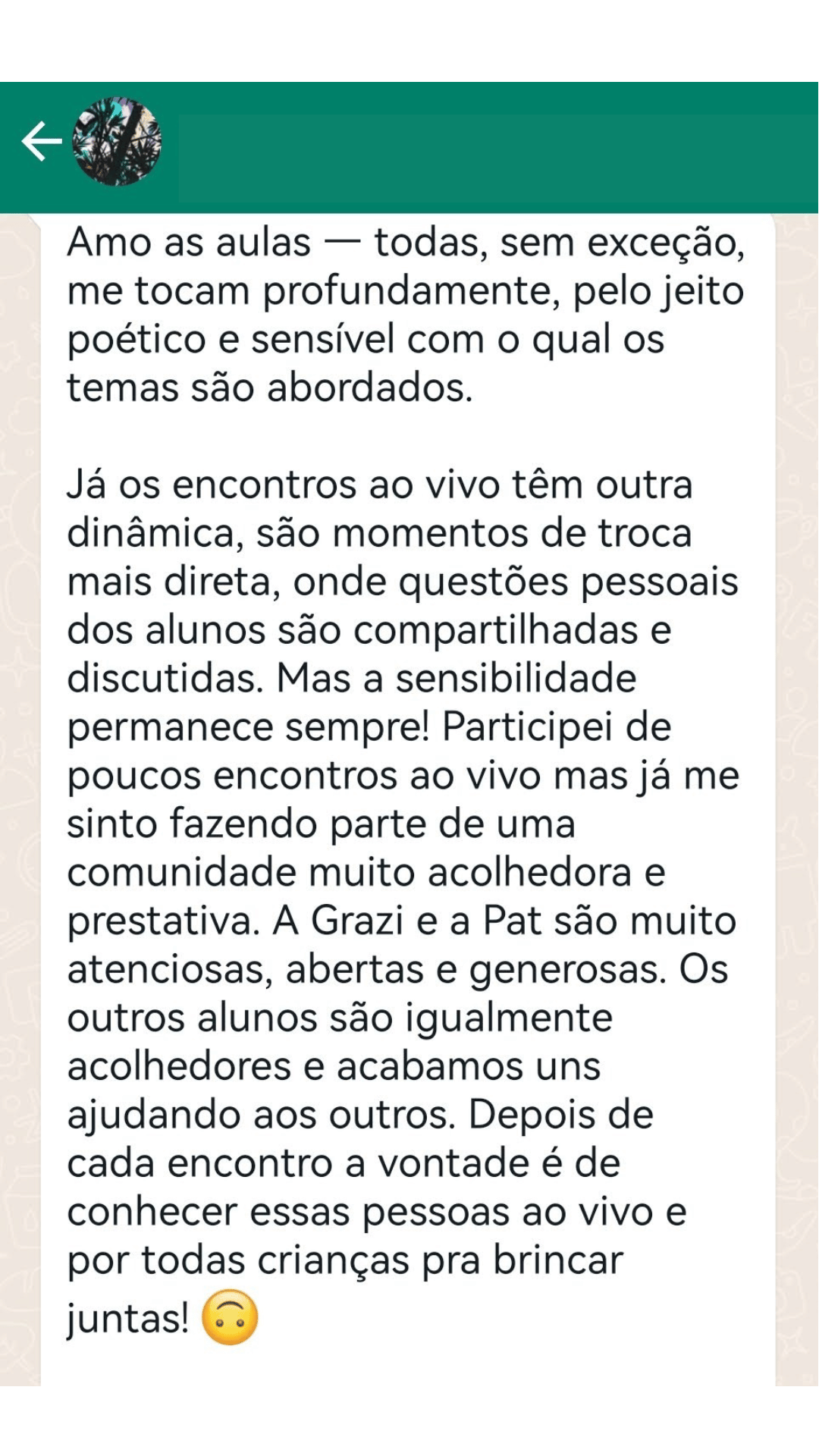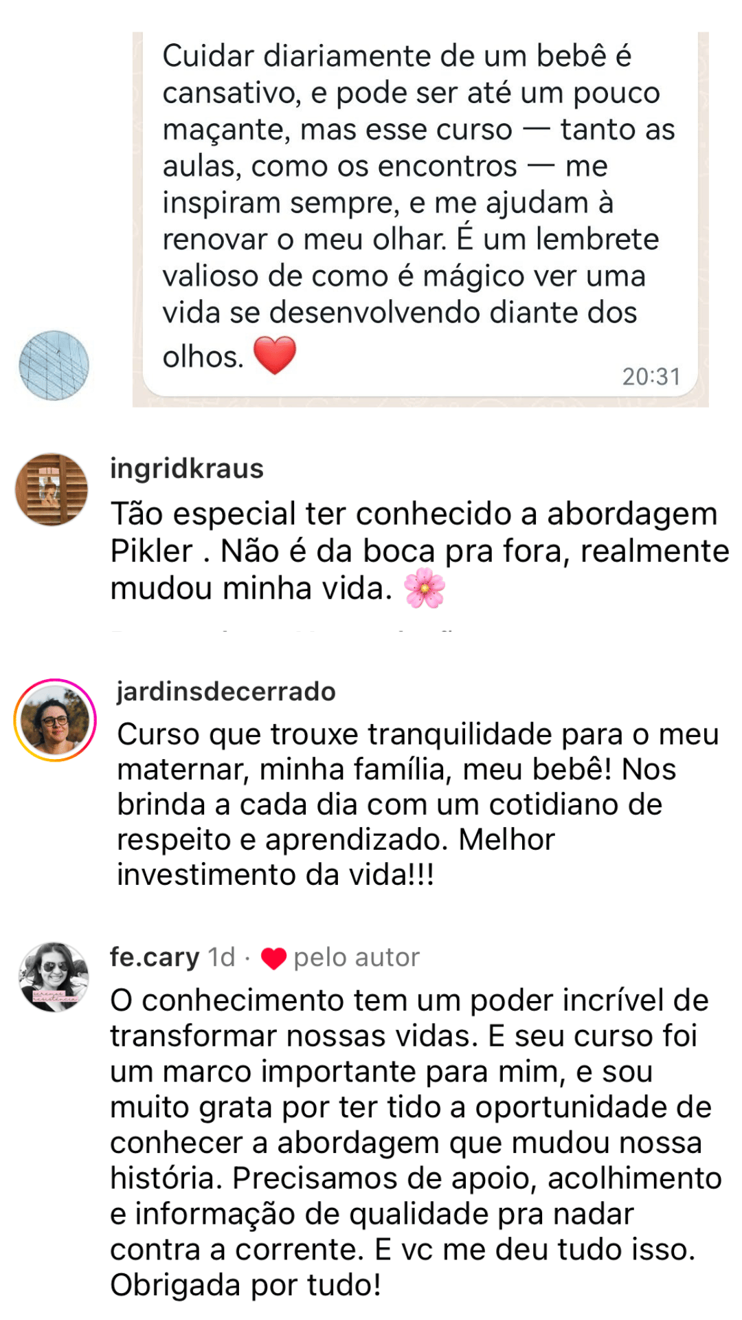 Agora que você já compreende, no seu corpo, a essência da abordagem, poderá levar esse olhar e essa atitude para toda situação cotidiana. Aqui vamos falar e ver muitas imagens sobre a introdução alimentar na abordagem Pikler, o brincar livre nos parquinhos, o brincar livre com água e na água, natação de bebês e desfralde. Nos encontros ao vivo temos abordado também temas como: quando e como introduzir materiais de pintura/desenho; leitura compartilhada e dicas de livros; convivência entre irmãos/crianças de idades diferentes; e como proporcionar um sono tranquilo.