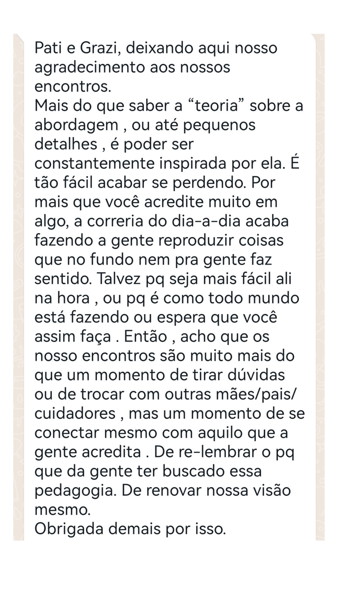 O acompanhamento da sua criança, o acolhimento dos seus conflitos, o esclarecimento das suas dúvidas… tudo isso de maneira amorosa, técnica e respeitosa, junto a outras mães-etc., que estarão vivendo o mesmo processo que você.